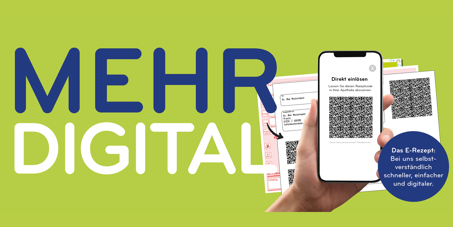 Seit dem 01.01.2024 müssen verschreibungspflichtige Arzneimittel als eRezept ausgestellt werden. Sie erhalten es von Ihrem Arzt wahlweise in elektronischer Form oder den QR-Code als Ausdruck auf Papier. Die neue Technik spart Zeit und Wege, sorgt für größere Sicherheit in der Arzneimitteltherapie.